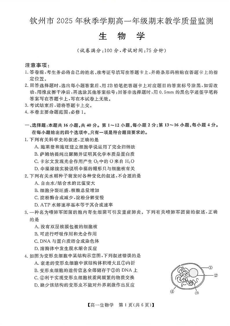 高一生物--广西钦州市2025-2026高一上学期期末教学质量检测