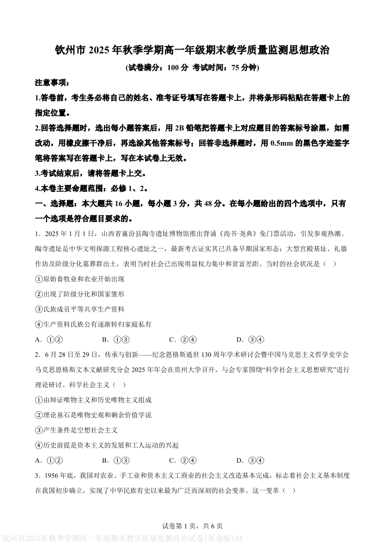 高一政治(原卷版)--广西钦州市2025-2026高一上学期期末教学质量检测
