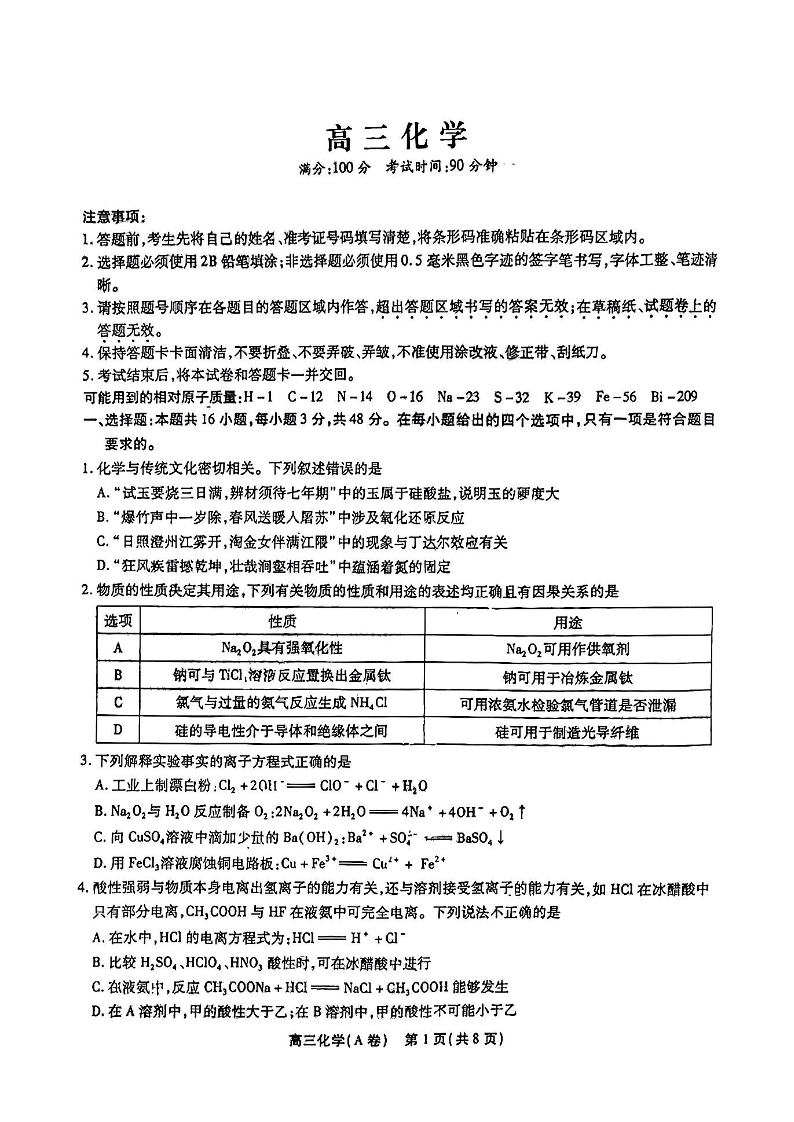 高三化学+答案--安徽2023届高三鼎尖名校联盟12月联考