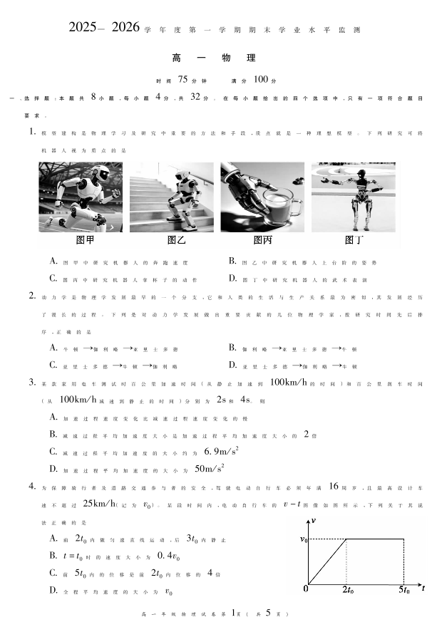 高一物理--安徽省蚌埠市2025—2026学年度高一第一学期期末学业水平监测
