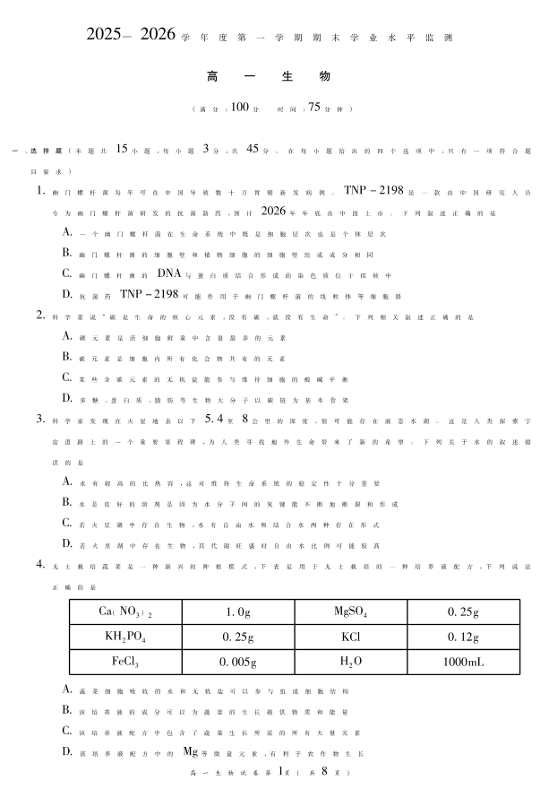 高一生物--安徽省蚌埠市2025—2026学年度高一第一学期期末学业水平监测