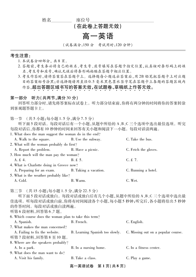 高一英语--安徽省皖江名校联盟2025-2026学年上学期高一期末考试