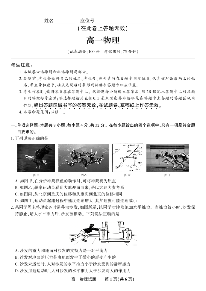 高一物理--安徽省皖江名校联盟2025-2026学年上学期高一期末考试