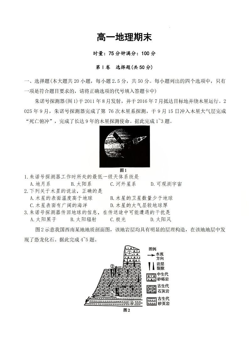 高一地理+答案--湖南省长沙市第一中学2025-2026学年高一上学期1月期末考试
