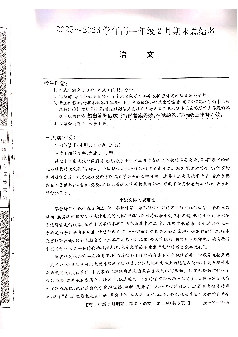 高一语文--山西省三晋卓越联盟2025-2026学年高一年级2月期末总结考