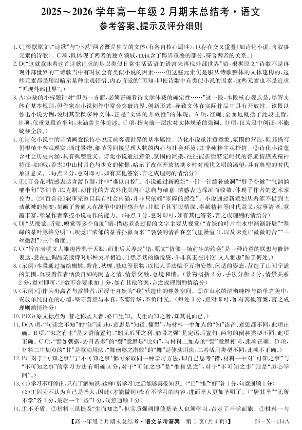 高一语文答案--山西省三晋卓越联盟2025-2026学年高一年级2月期末总结考