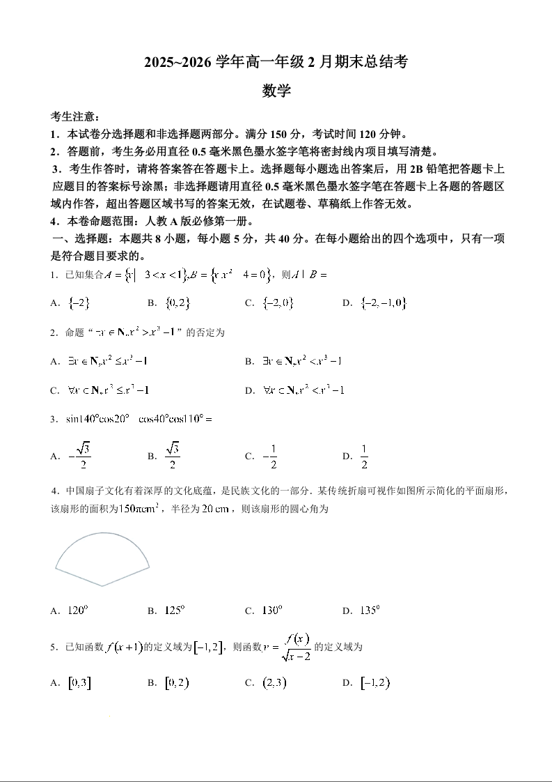 高一数学+答案--山西省三晋卓越联盟2025-2026学年高一年级2月期末总结考