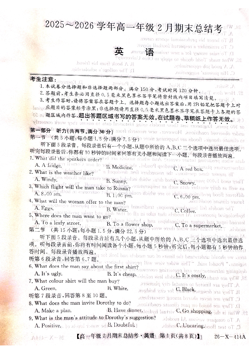 高一英语+答案--山西省三晋卓越联盟2025-2026学年高一年级2月期末总结考
