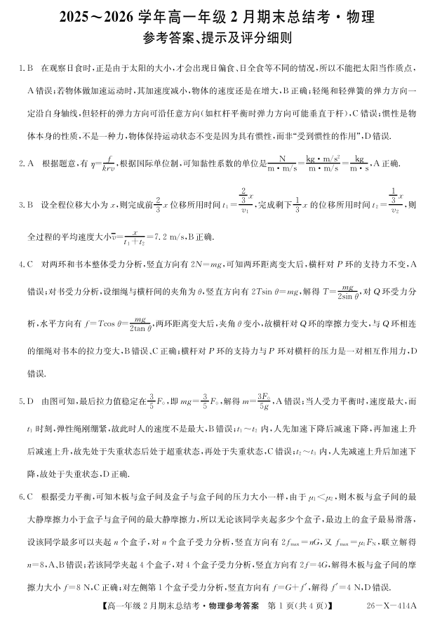 高一物理答案--山西省三晋卓越联盟2025-2026学年高一年级2月期末总结考