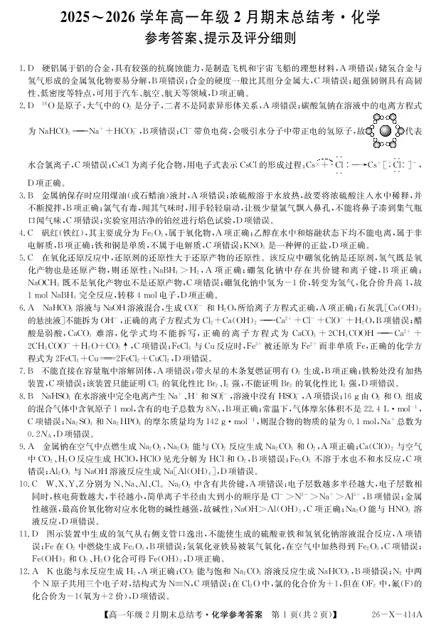 高一化学答案--山西省三晋卓越联盟2025-2026学年高一年级2月期末总结考