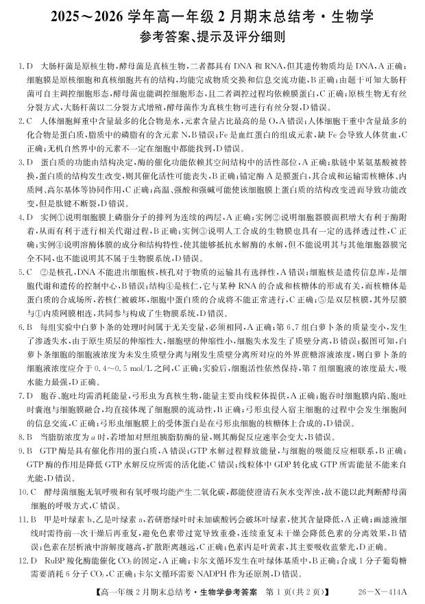 高一生物答案--山西省三晋卓越联盟2025-2026学年高一年级2月期末总结考