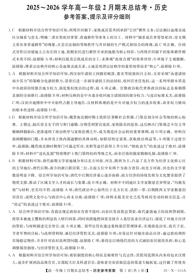 高一历史答案--山西省三晋卓越联盟2025-2026学年高一年级2月期末总结考