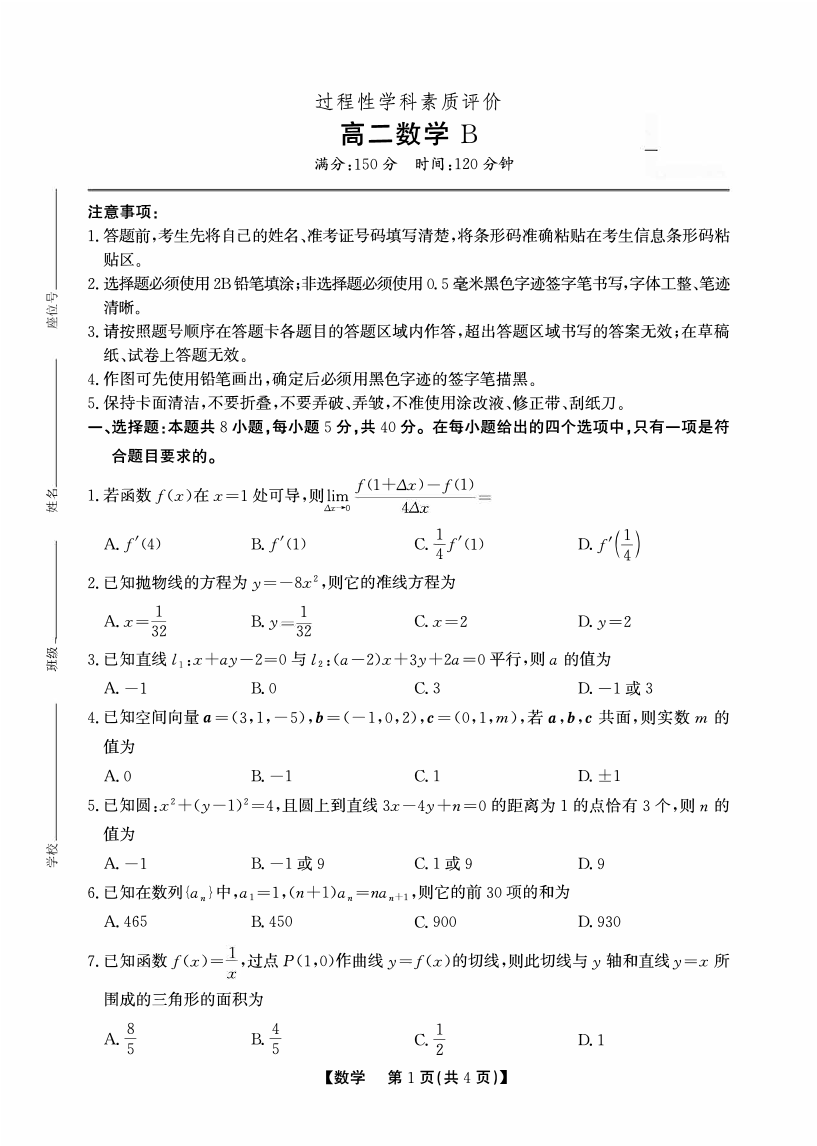 高二数学B卷--安徽省鼎尖联考2025-2026学年高二上学期期末过程性学科素质评价