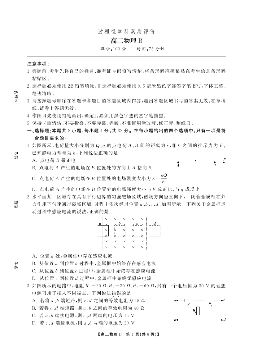 高二物理B卷--安徽省鼎尖联考2025-2026学年高二上学期期末过程性学科素质评价