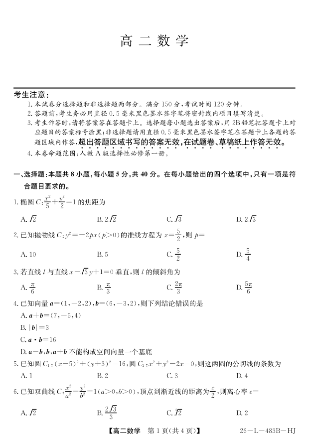 高二数学(HJ)--安徽省江淮名校2025-2026学年高二上学期2月期末联考