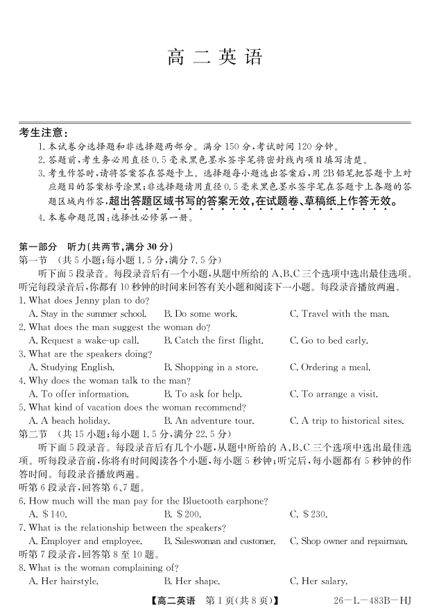 高二英语(HJ)--安徽省江淮名校2025-2026学年高二上学期2月期末联考