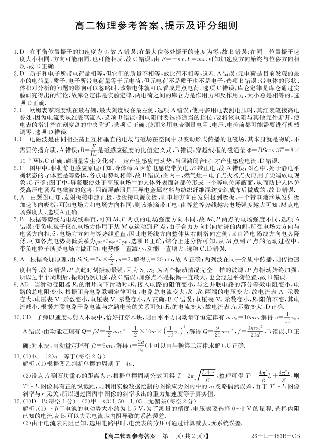 高二物理(CB)答案--安徽省江淮名校2025-2026学年高二上学期2月期末联考