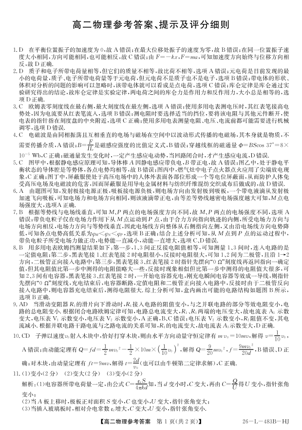 高二物理(HJ)答案--安徽省江淮名校2025-2026学年高二上学期2月期末联考