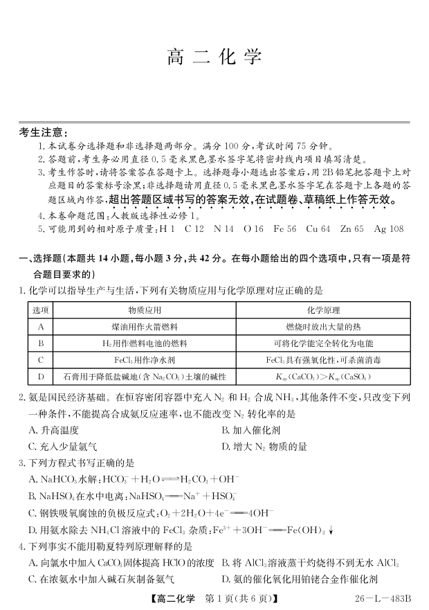 高二化学--安徽省江淮名校2025-2026学年高二上学期2月期末联考