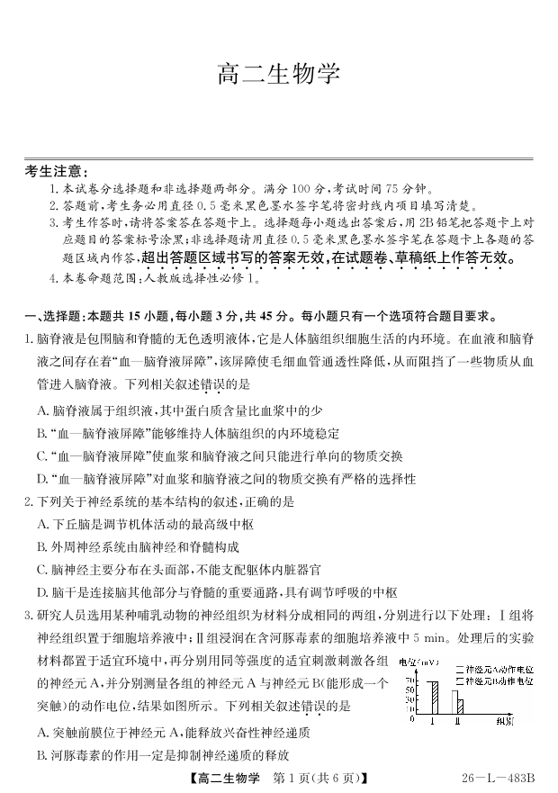 高三生物--安徽省江淮名校2025-2026学年高二上学期2月期末联考