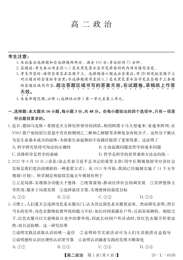 高二政治--安徽省江淮名校2025-2026学年高二上学期2月期末联考