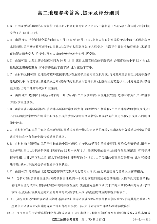 高二地理答案--安徽省江淮名校2025-2026学年高二上学期2月期末联考