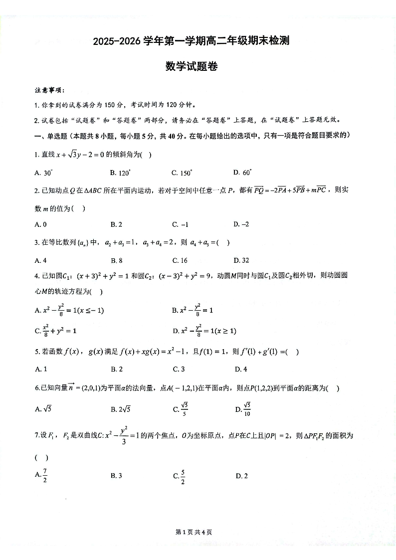 高二数学--安徽省智学大联考·皖中名校联盟2025-2026学年高二上学期期末检测