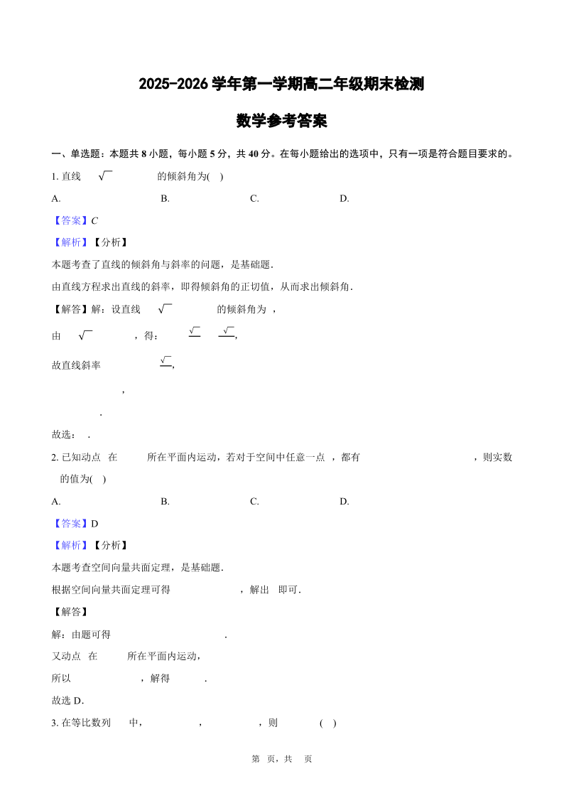 高二数学答案--安徽省智学大联考·皖中名校联盟2025-2026学年高二上学期期末检测