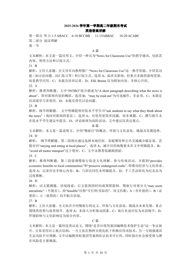 高二英语答案--安徽省智学大联考·皖中名校联盟2025-2026学年高二上学期期末检测