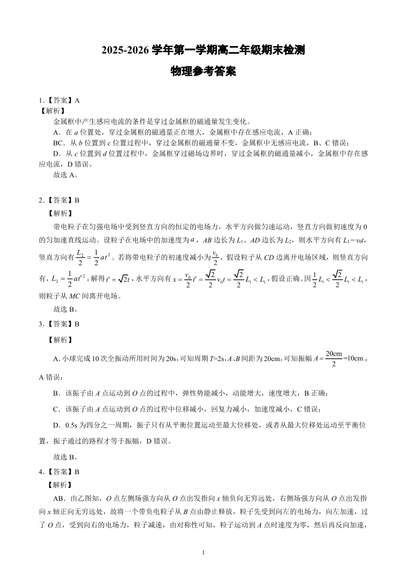 高二物理答案--安徽省智学大联考·皖中名校联盟2025-2026学年高二上学期期末检测
