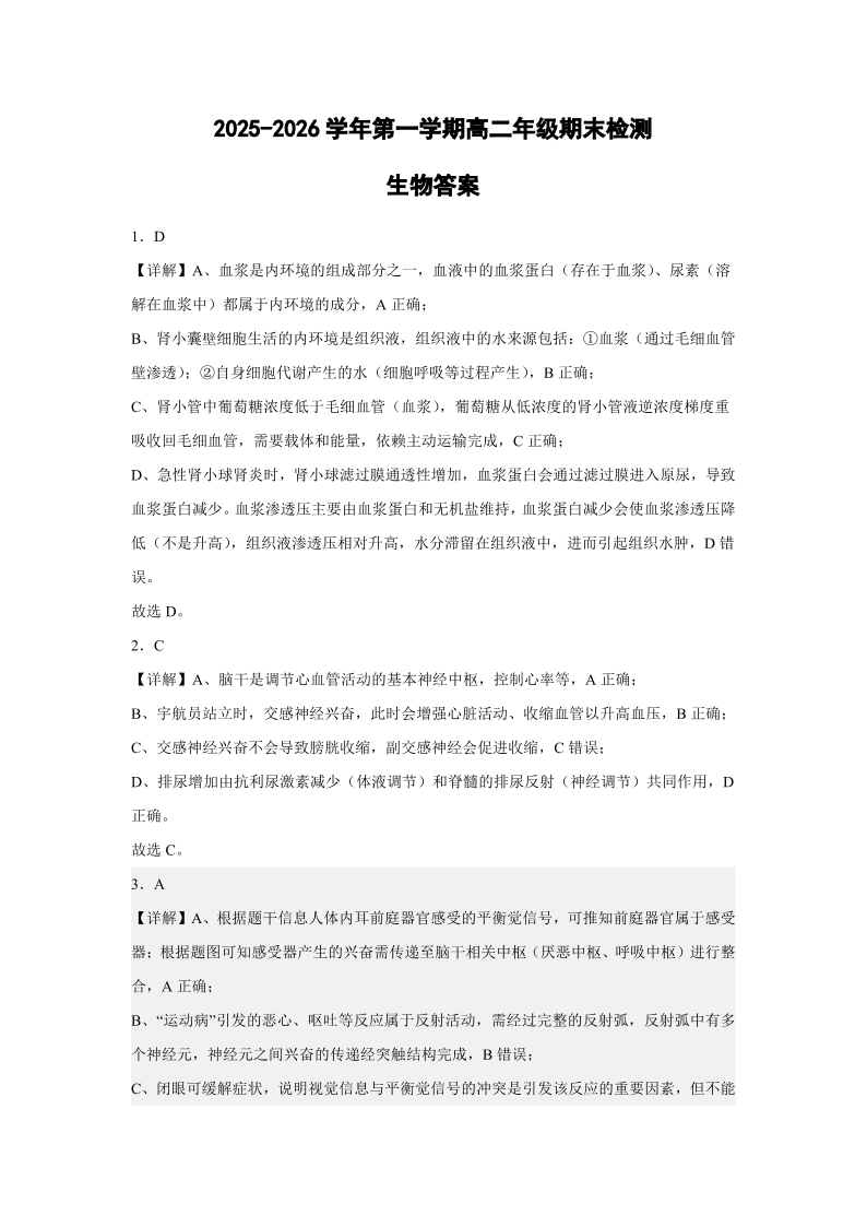 高二生物答案--安徽省智学大联考·皖中名校联盟2025-2026学年高二上学期期末检测