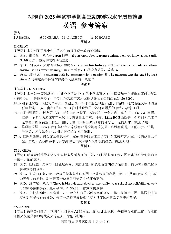 高三英语答案--广西河池市2026届高三上学期期末学业水平质量检测