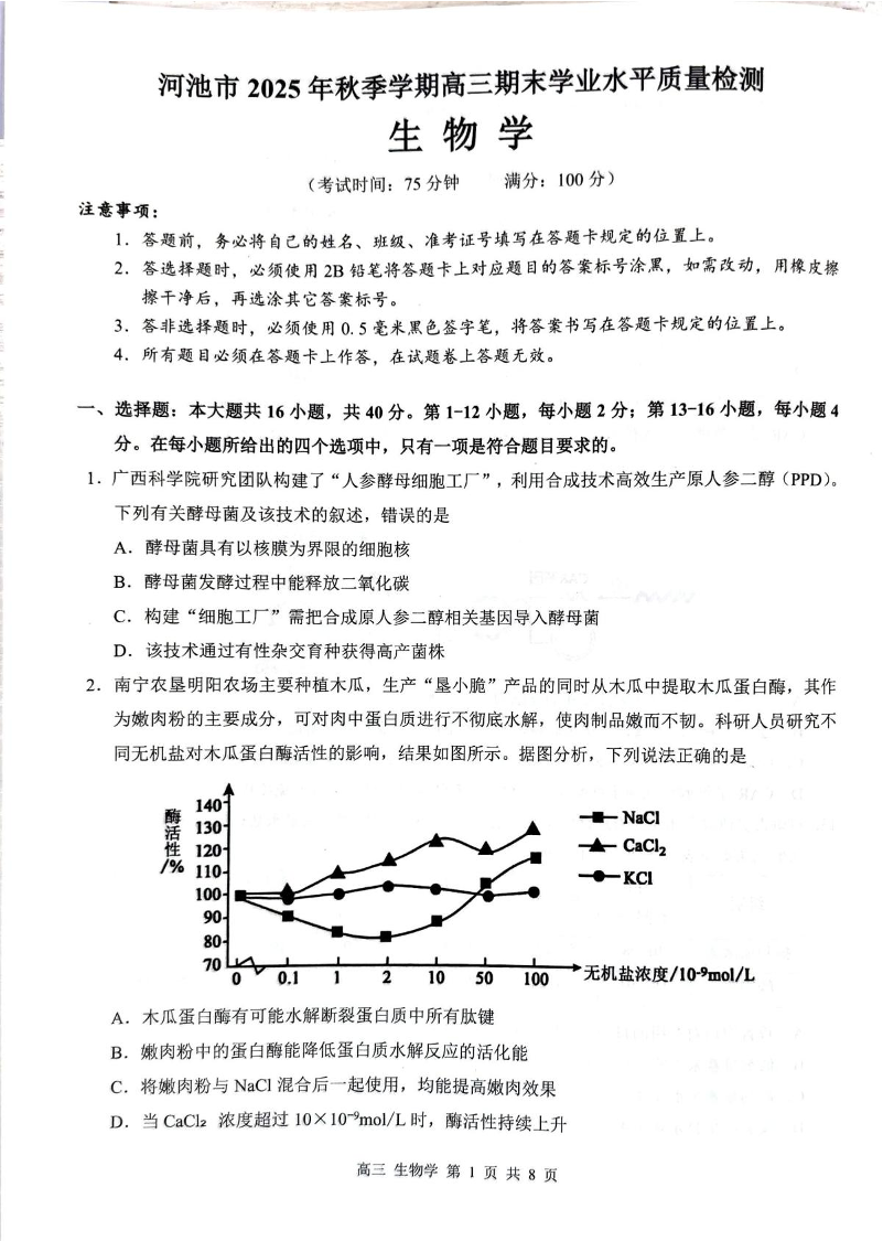 高三生物--广西河池市2026届高三上学期期末学业水平质量检测