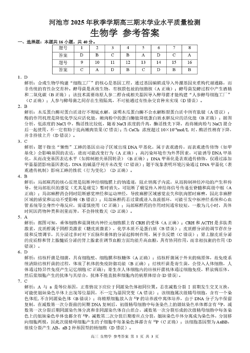高三生物答案--广西河池市2026届高三上学期期末学业水平质量检测