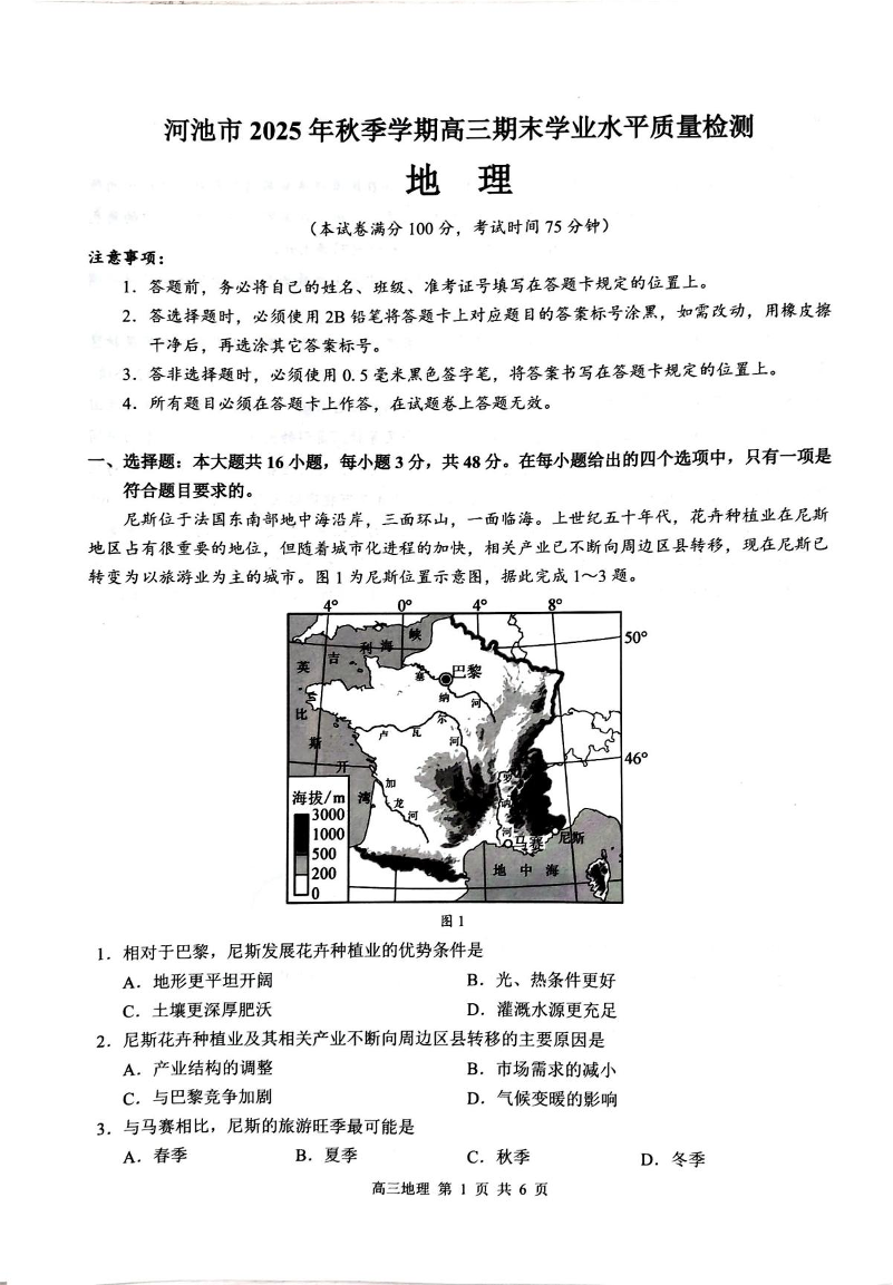 高三地理--广西河池市2026届高三上学期期末学业水平质量检测