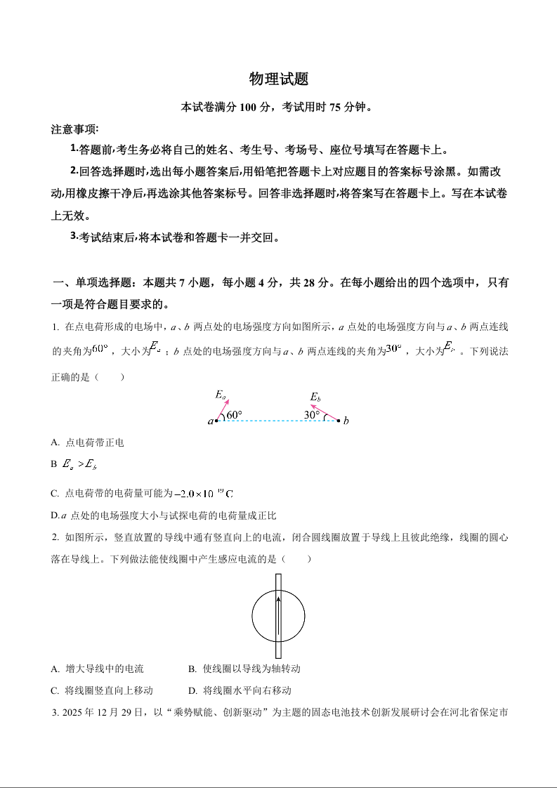 高二物理+答案--河北省保定市2025-2026学年高二上学期1月期末考试