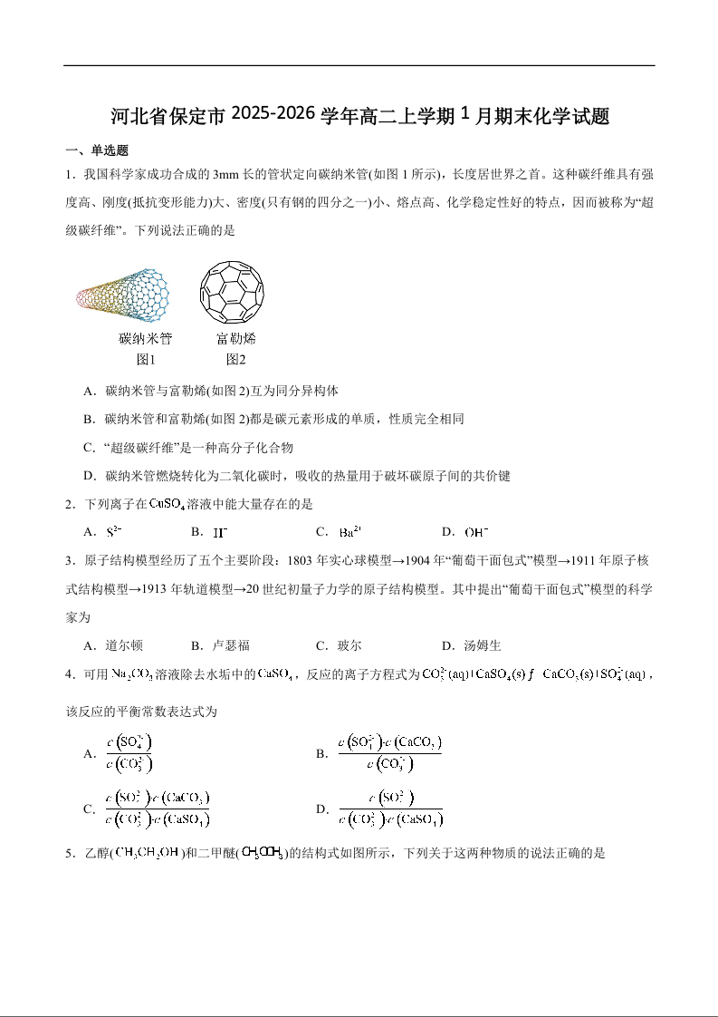高二化学+答案--河北省保定市2025-2026学年高二上学期1月期末考试
