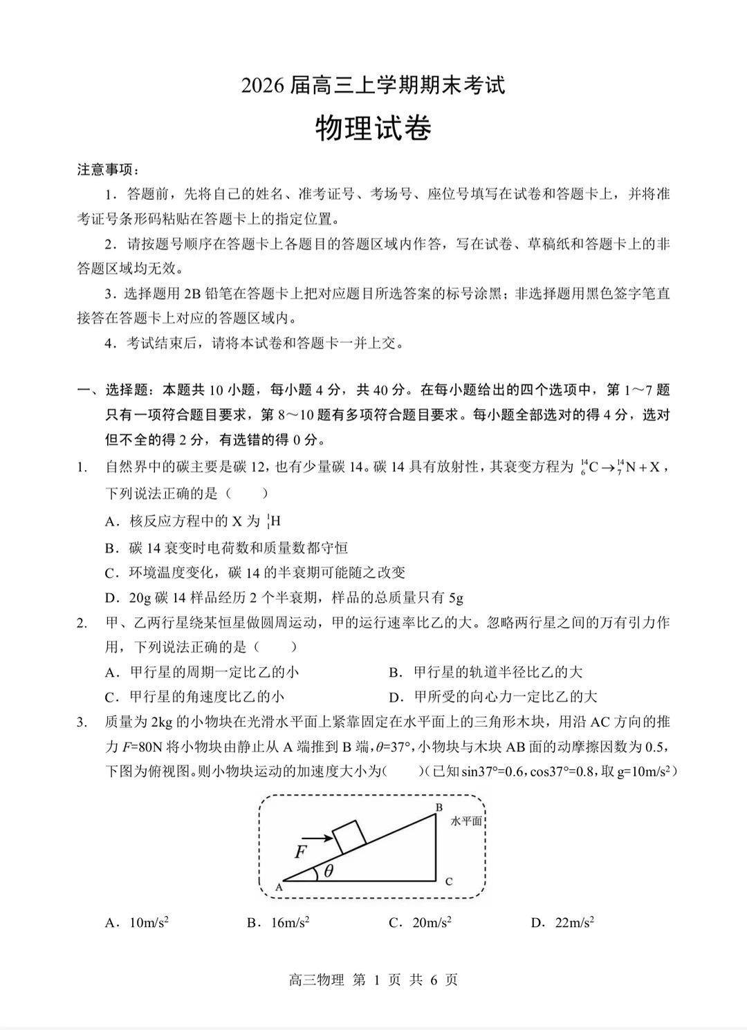 高三物理+答案--湖北部分重点中学2026届高三上学期第二次联考