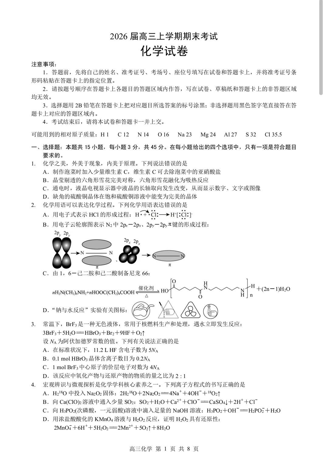 高三化学+答案--湖北部分重点中学2026届高三上学期第二次联考