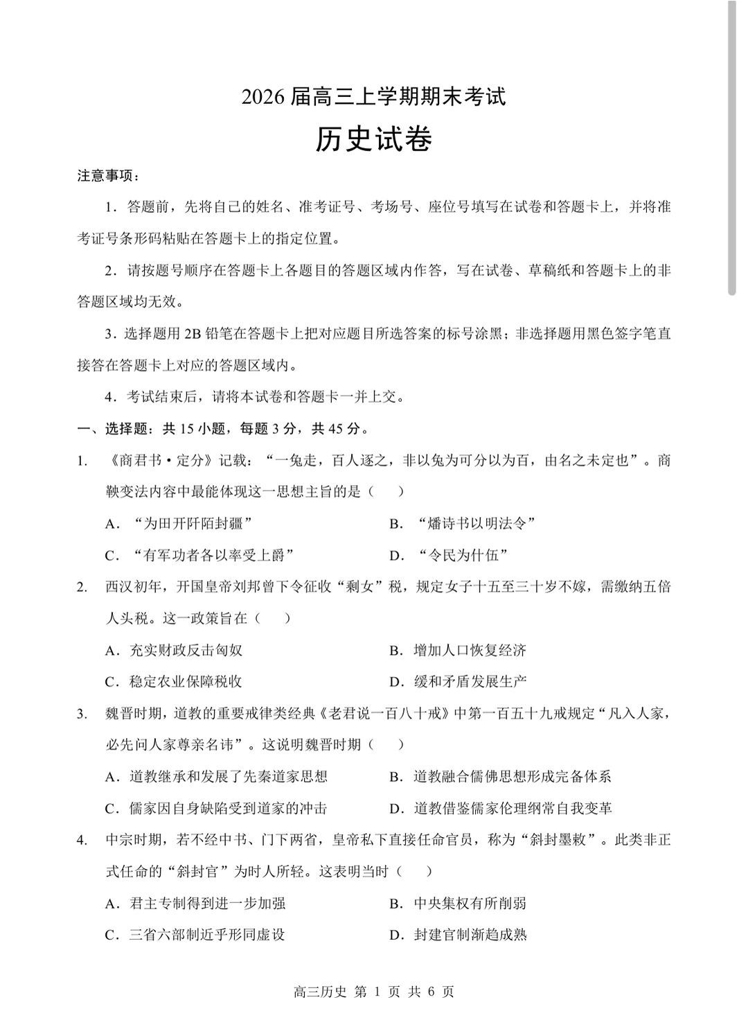 高三历史+答案--湖北部分重点中学2026届高三上学期第二次联考