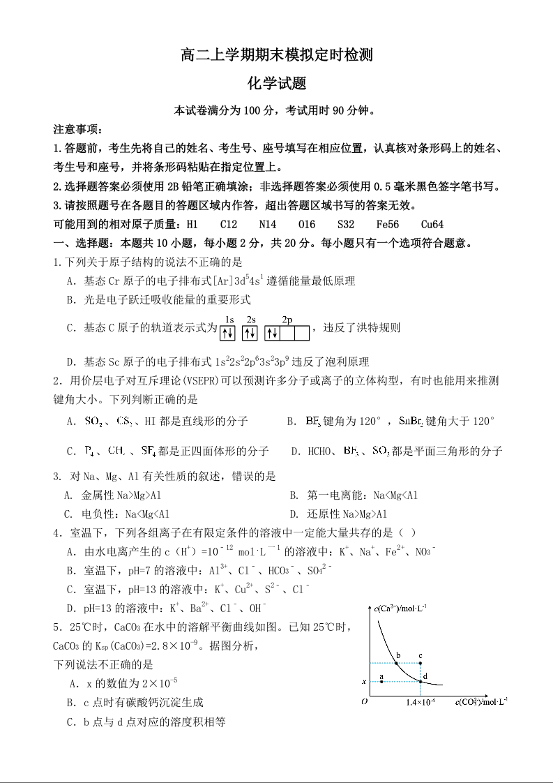 高二化学--山东省枣庄市第八中学2025-2026学年高二上学期1月月考
