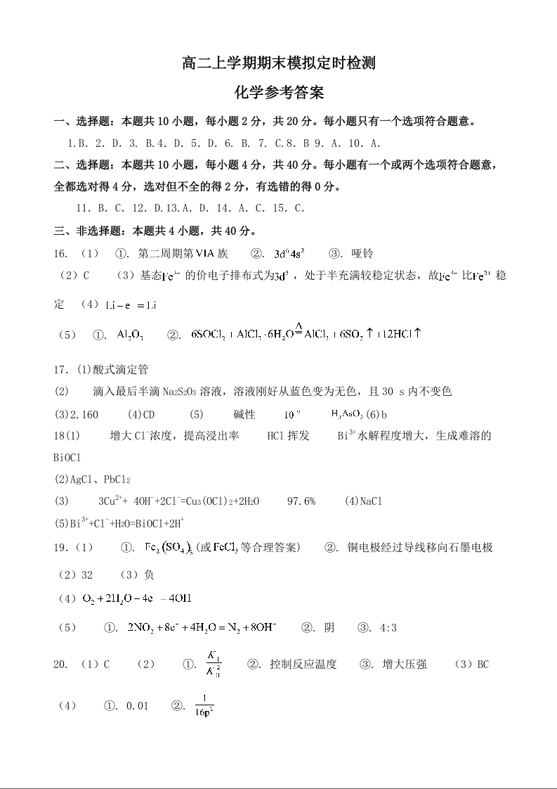 高二化学答案--山东省枣庄市第八中学2025-2026学年高二上学期1月月考