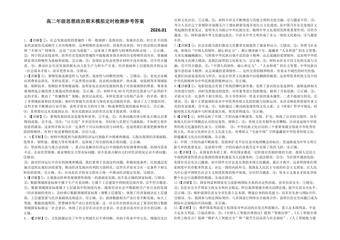 高二政治答案--山东省枣庄市第八中学2025-2026学年高二上学期1月月考