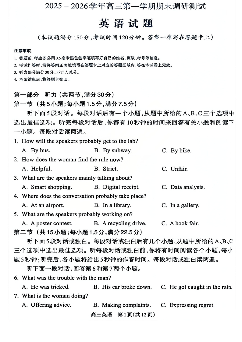 高三英语--山西省吕梁2026届高三上学期1月期末调研