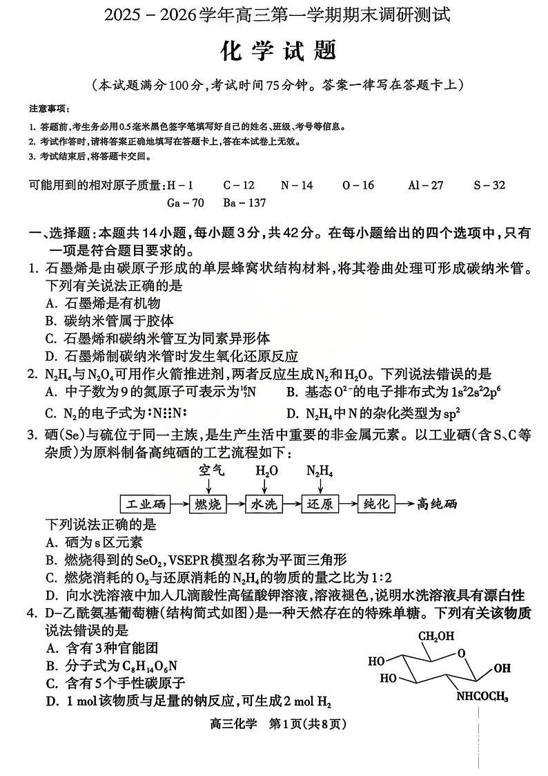 高三化学--山西省吕梁2026届高三上学期1月期末调研