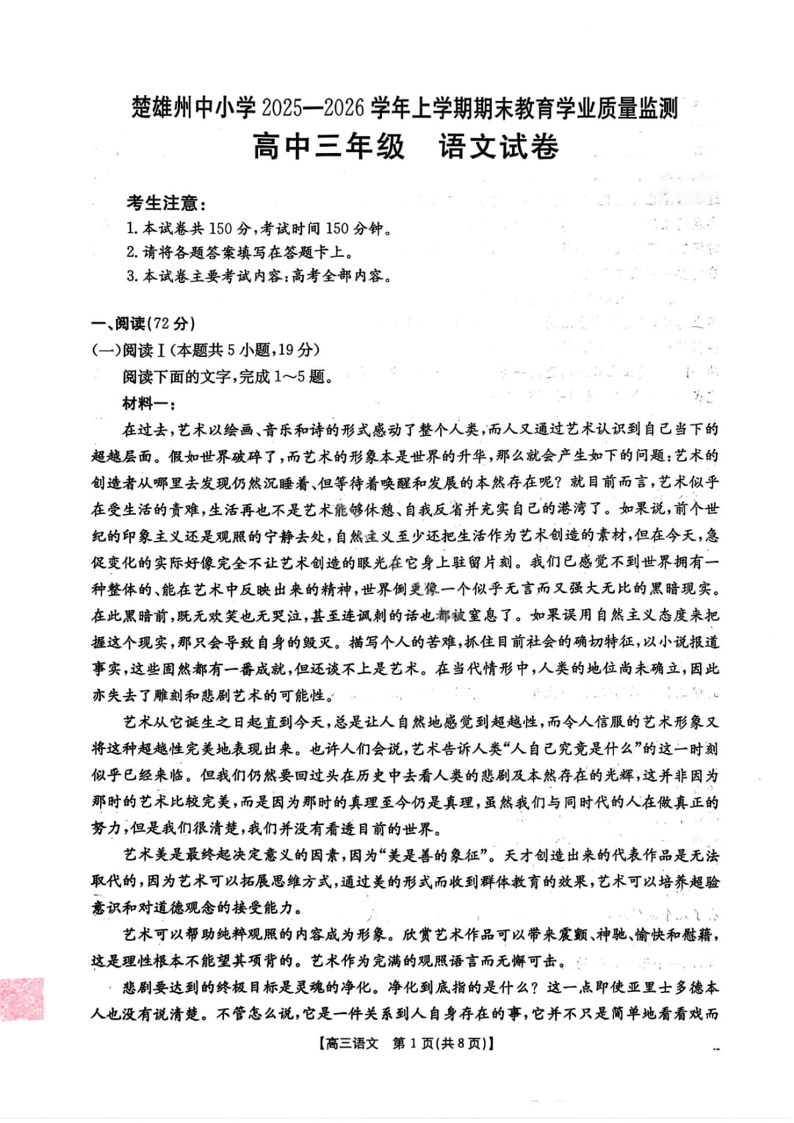 高三语文+答案--云南省楚雄州2026届高三上学期1月期末教育学业质量监测