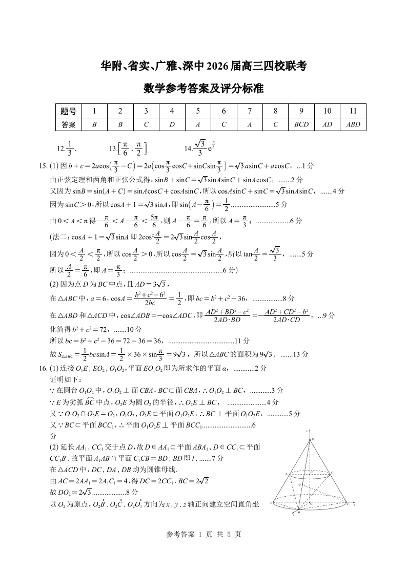 高三数学答案--广东省华附、省实、广雅、深中2026届高三四校联考1月期末考试数学