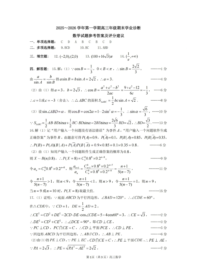 高三数学答案--山西省太原市2026届第一学期高三年级期末学业诊断数学