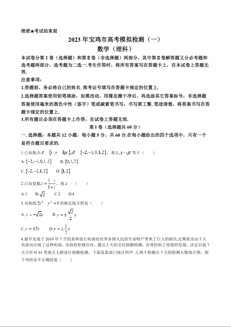 高三理科数学+答案--陕西省宝鸡市2022-2023学年高三上学期高考模拟检测(一)