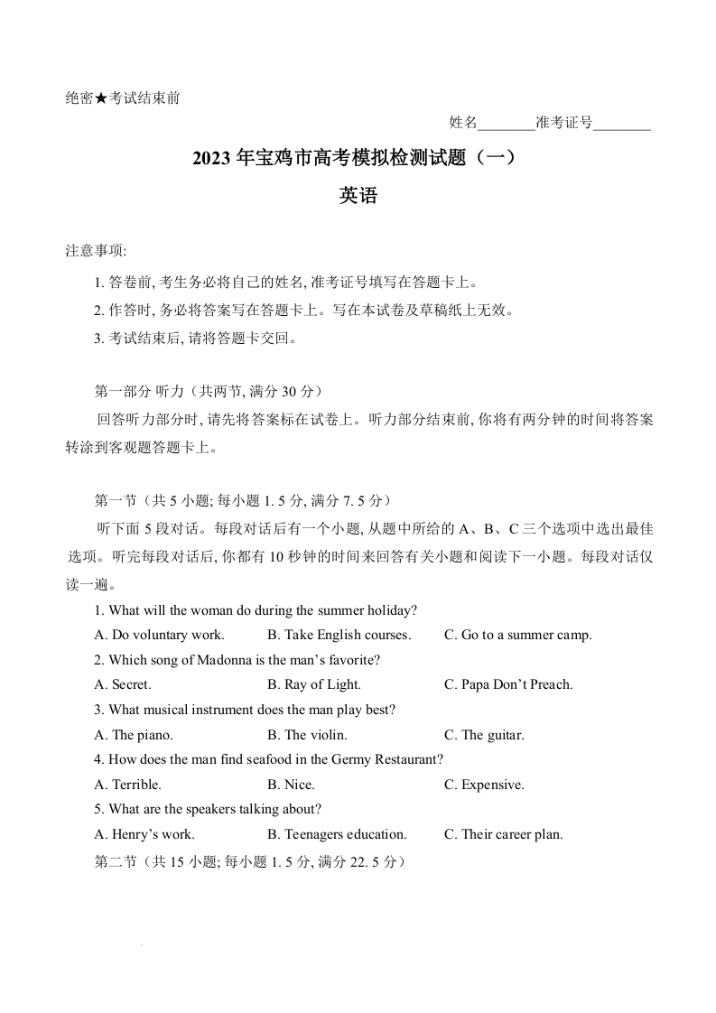 高三英语--陕西省宝鸡市2022-2023学年高三上学期高考模拟检测(一)